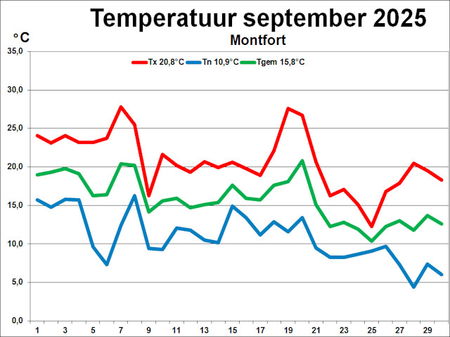 ( T = maximum- minimum- en 24-uursgemiddelde temperatuur in °C, N = neerslag in mm, LD = gemiddelde luchtdruk in hPa ).